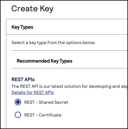 The Create Key page appears. - ChooseREST – Shared Secretand clickGenerate key.