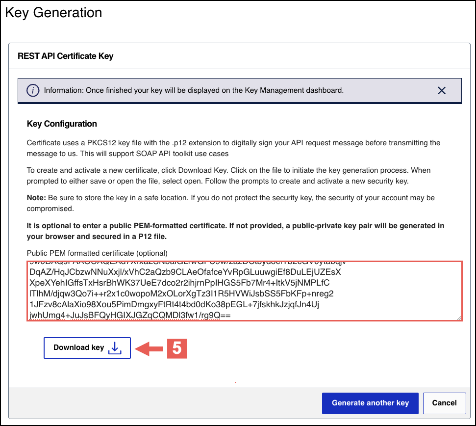 - Enter your public PEM-formatted certificate in the text box, then clickDownload key