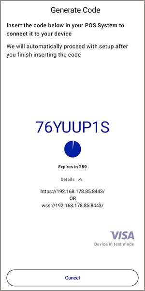 - On the Generate Code screen, tap theDetailsarrow. The Details section expands to show the HTTP and WSS (WebSocket) addresses and the port number.